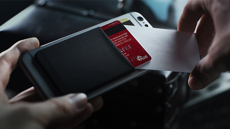 The magician removes their phone, asking the spectator if they too have a cell phone. (who hasn't?). A business card is removed from the credit card holder attached to your phone.